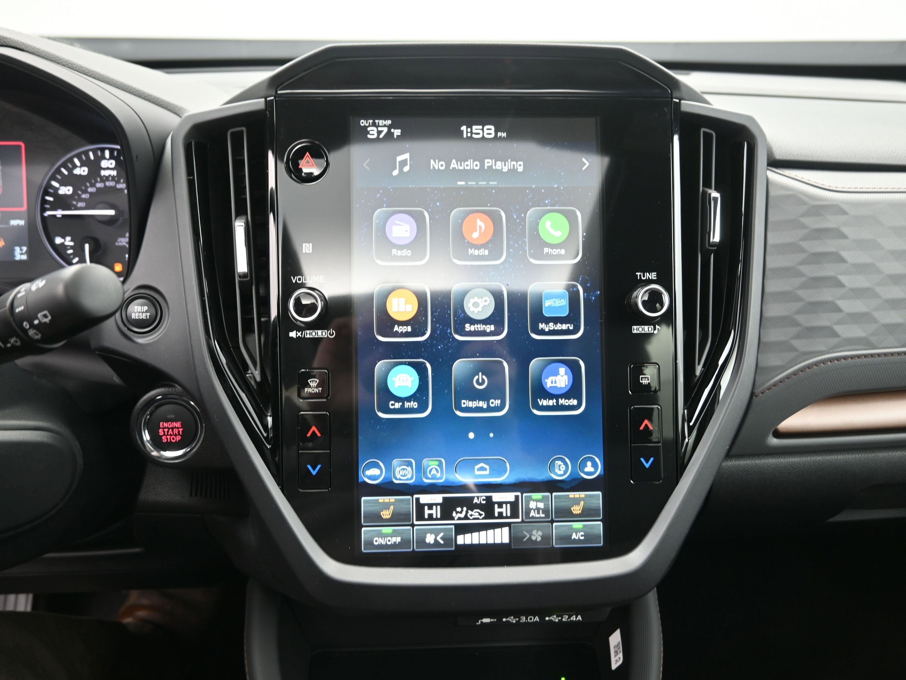 - Radio: Subaru 11.6" Multimedia Plus System -inc: valet mode, integrated center information display, AM/FM stereo HD Radio, multi-touch gesture high resolution display screen, voice activated controls, Bluetooth® audio streaming and hands-free phone connectivity w/SMS text messaging (refer to Subaru.com for cellphone compatibility), iPod control capability, smartphone integration: Android Auto and Apple CarPlay w/full screen view and wireless connection, USB and Over The Air (OTA) audio system update, steering wheel controls, 6 speakers, 3.5mm auxiliary input jack and roof mounted audio and satellite antenna